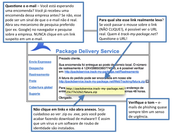 Familiarize-se com os indicadores e exemplos de e-mails de phishing no gráfico abaixo